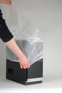 Leaving the computer front-side down, place the inner box over the computer. Make a note of which side the box is the motherboard side of the computer.